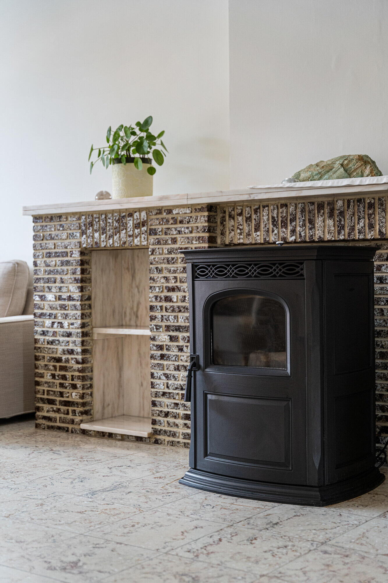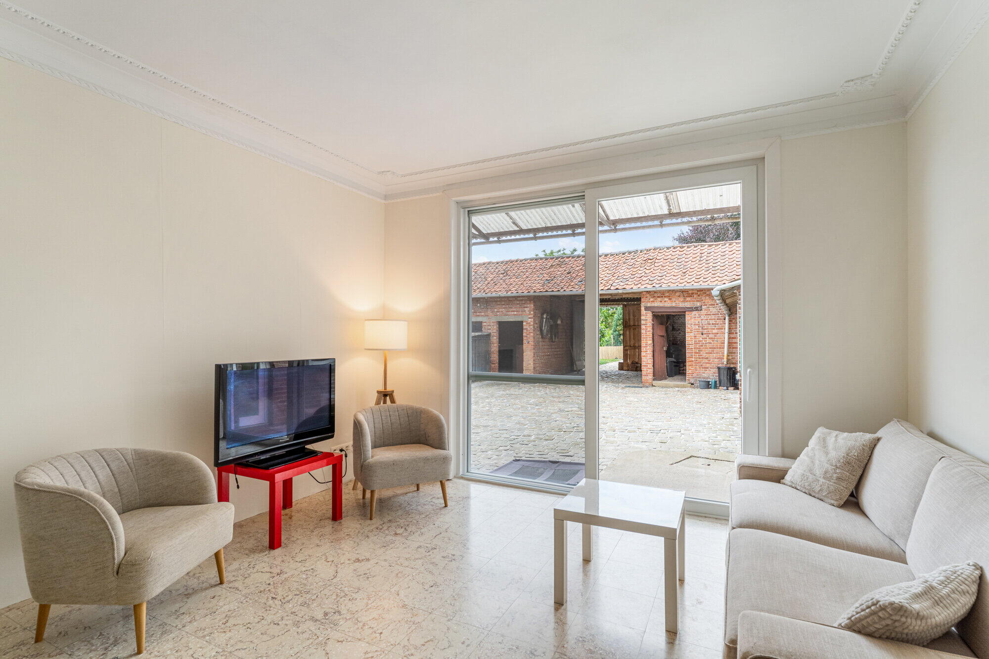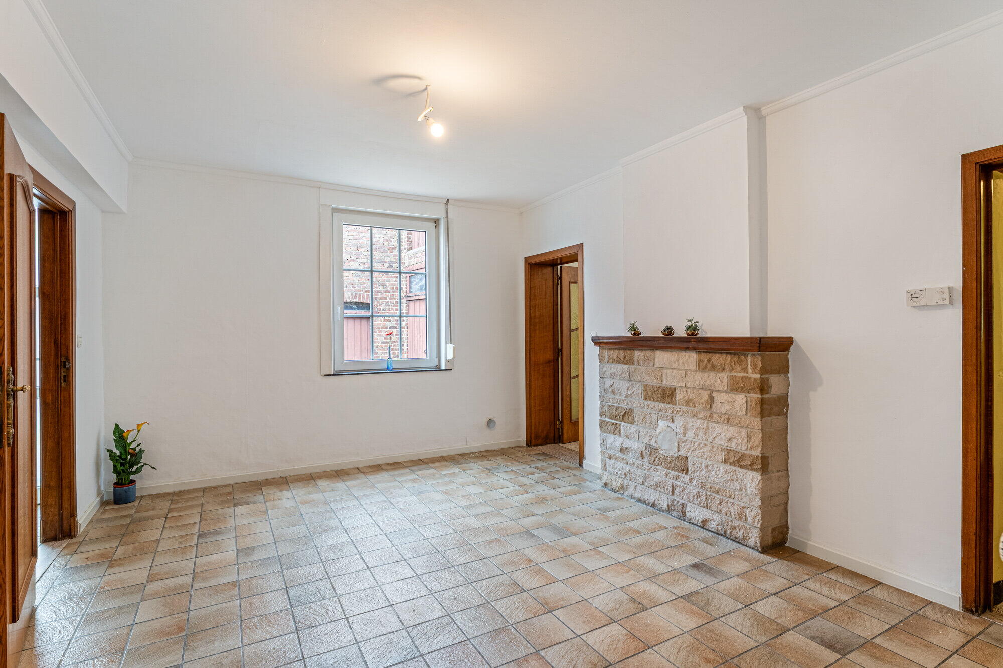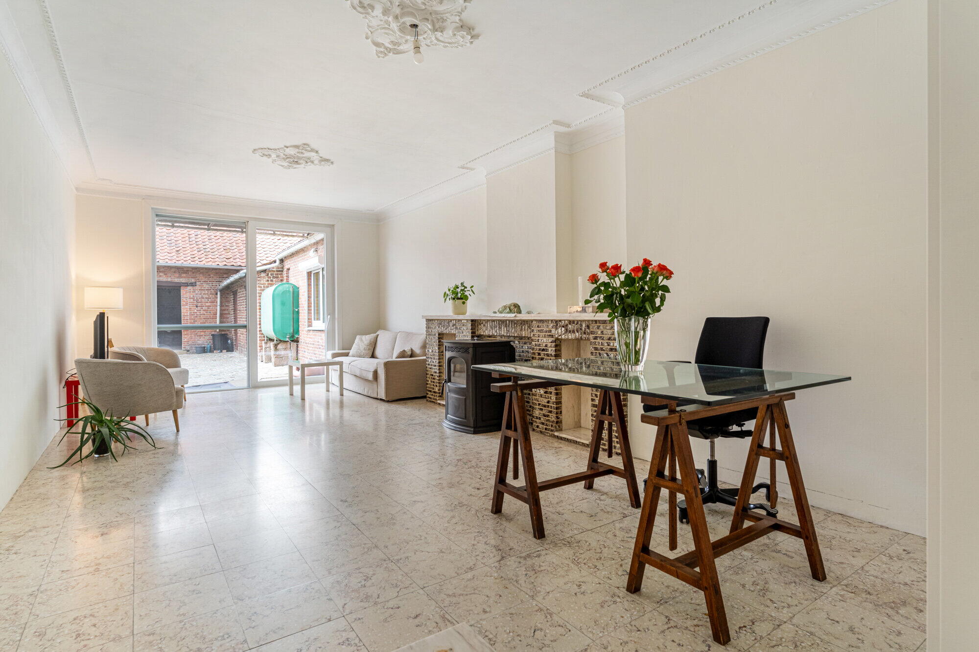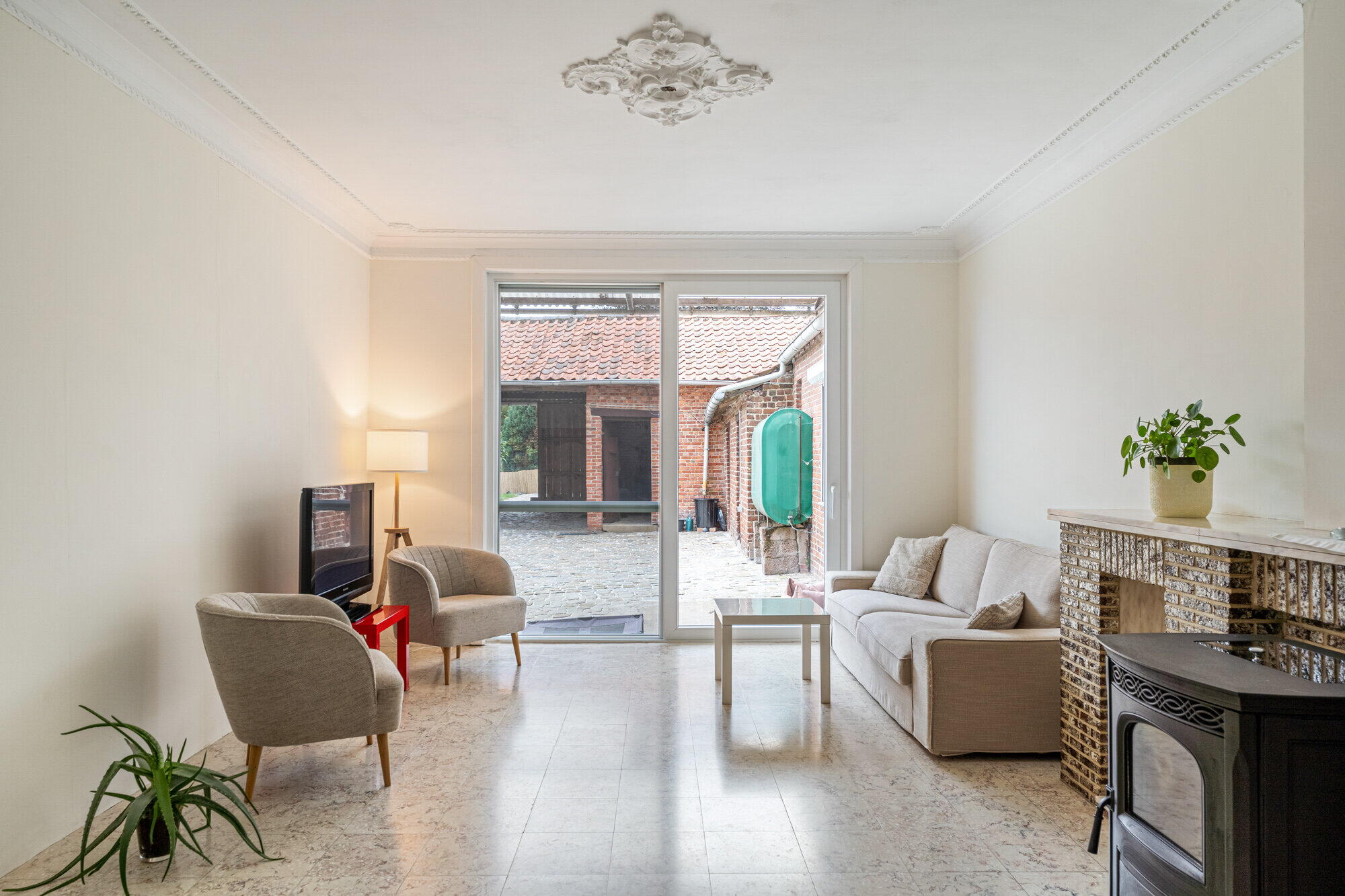- Woonkamer, betegeld, met airco en pelletkachel, schuifraam met vliegenhor, dat toegang geeft tot de binnenkoer;