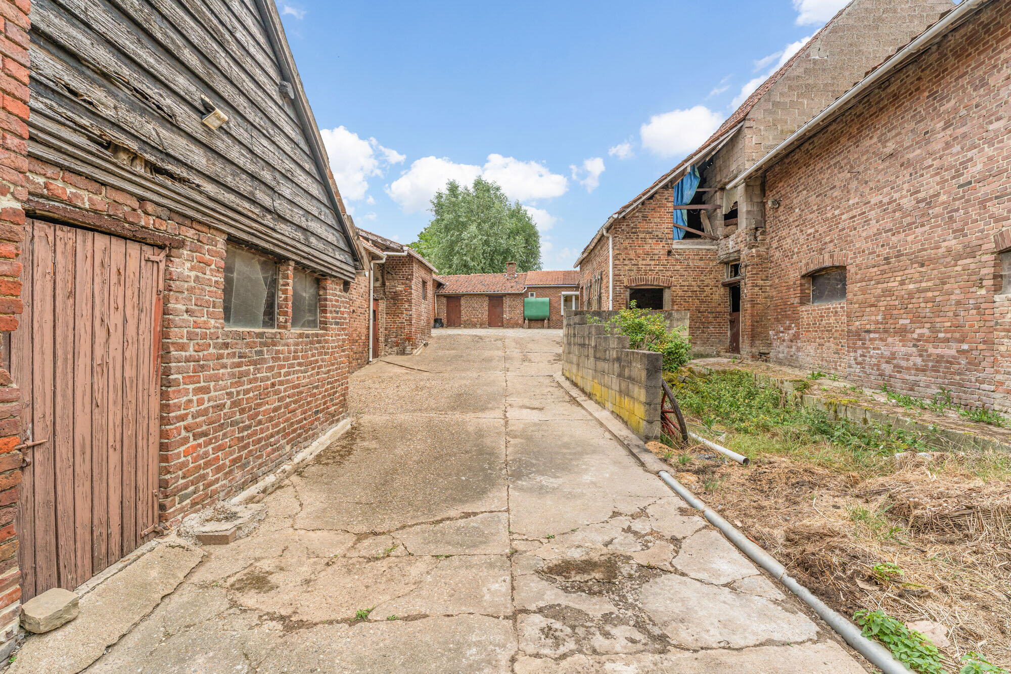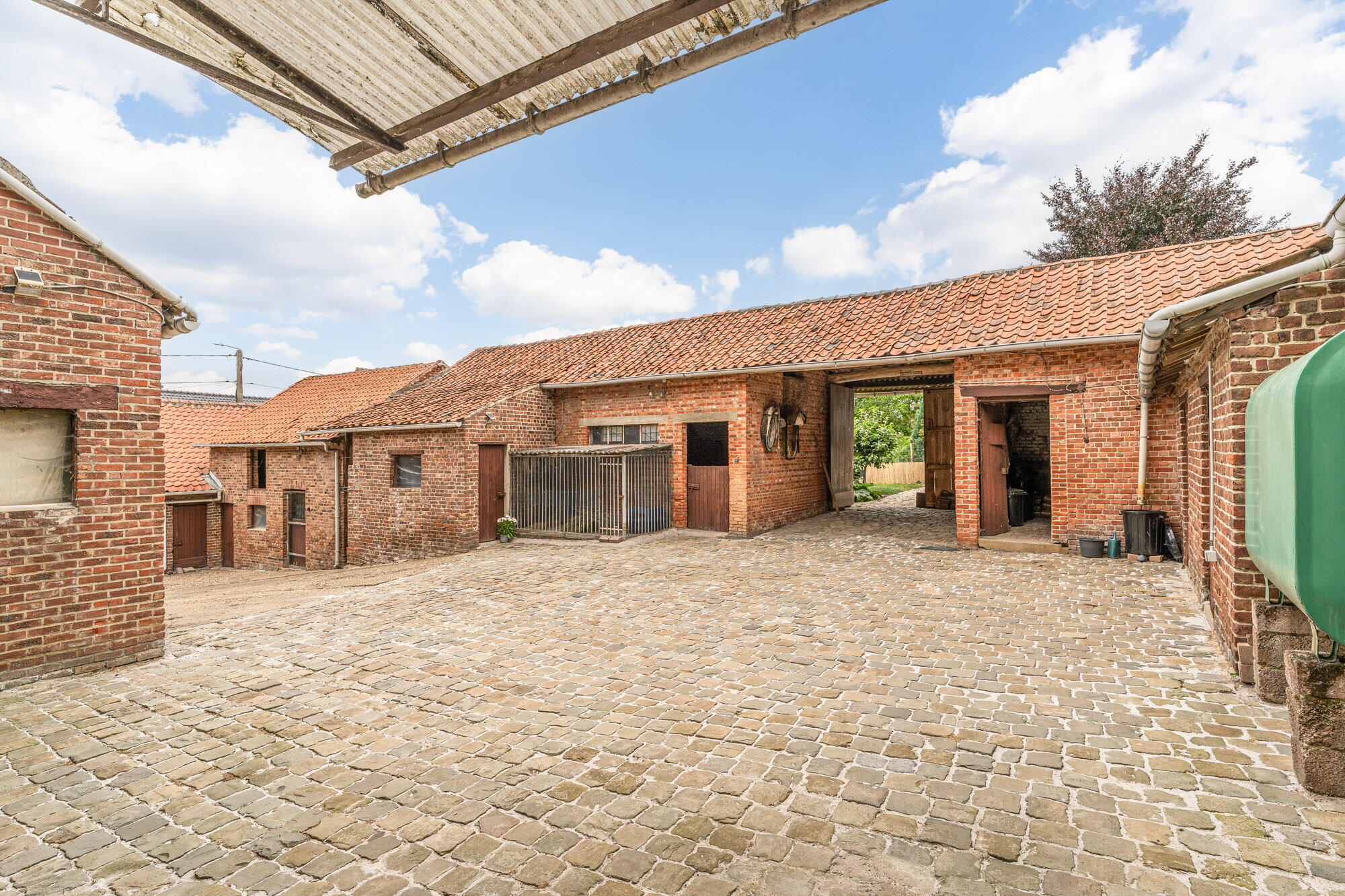 - Grote houten toegangspoort, voldoende plaats voor 1 wagen, voorzien van wateraansluiting en 1 elektriciteitsaansluiting;